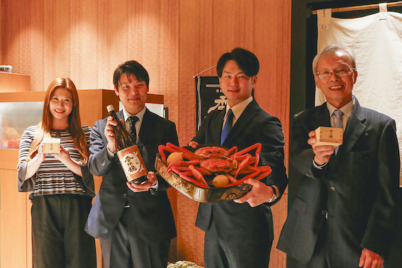 先日開催された記者会見の様子。右から2番目が当社 取締役副社長 上垣匡智。右端が香住水産加工業協同組合 組合長 田中一行様、左から2番目が香住鶴株式会社 代表取締役社長 福本和広様、左端が香美観光大使で元NMB48メンバーの石田優美様
