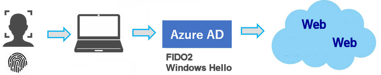 ID・パスワードのみの認証は厳密な本人確認が出来ないという欠点があり、Microsoft社のアカウントサービスであるAzure ADでも、生体認証などを利用しての厳格な本人確認が可能です。今回リリースのWebサーバーでは、AzureADの生体認証方式(Windows Hello やFIDO2)による顔認証や指紋認証と連携してシングルサインオンでターゲットのWebサーバーへアクセスする構成に対応しています。