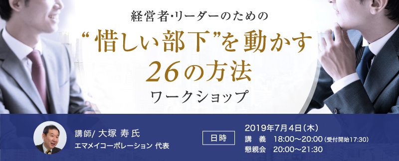 近年、若手社員が入社後に即日退職してしまう、職場で少し辛いことがあるとすぐにやめてしまう…といったケースが増えています。退職代行サービスなども話題の今、経営者・リーダー各位にとって、切実な問題である「部下の扱い方」。特に「動いてもらう」「活躍してもらう」ため、部下のモチベーションを高める【26の方法】について、リクルート出身、累計28万部『40代を後悔しない50のリスト』などの著者であり、現在は法人コンサルティングや企業研修を展開する、エマメイコーポレーション代表取締役 大塚寿氏に解説いただきます。当日は、部下のタイプ別に対処法をお伝えすると同時に、「指導法が合っていない」「時間がない」「知見がない」など、ご自身のタイプ分析もしていただきながら、チーム力を向上するための具体的なメソッドをお持ち帰りいただけます。講義後には、大塚氏を交えて、情報交換やネットワーク構築いただける懇親会も予定しています。