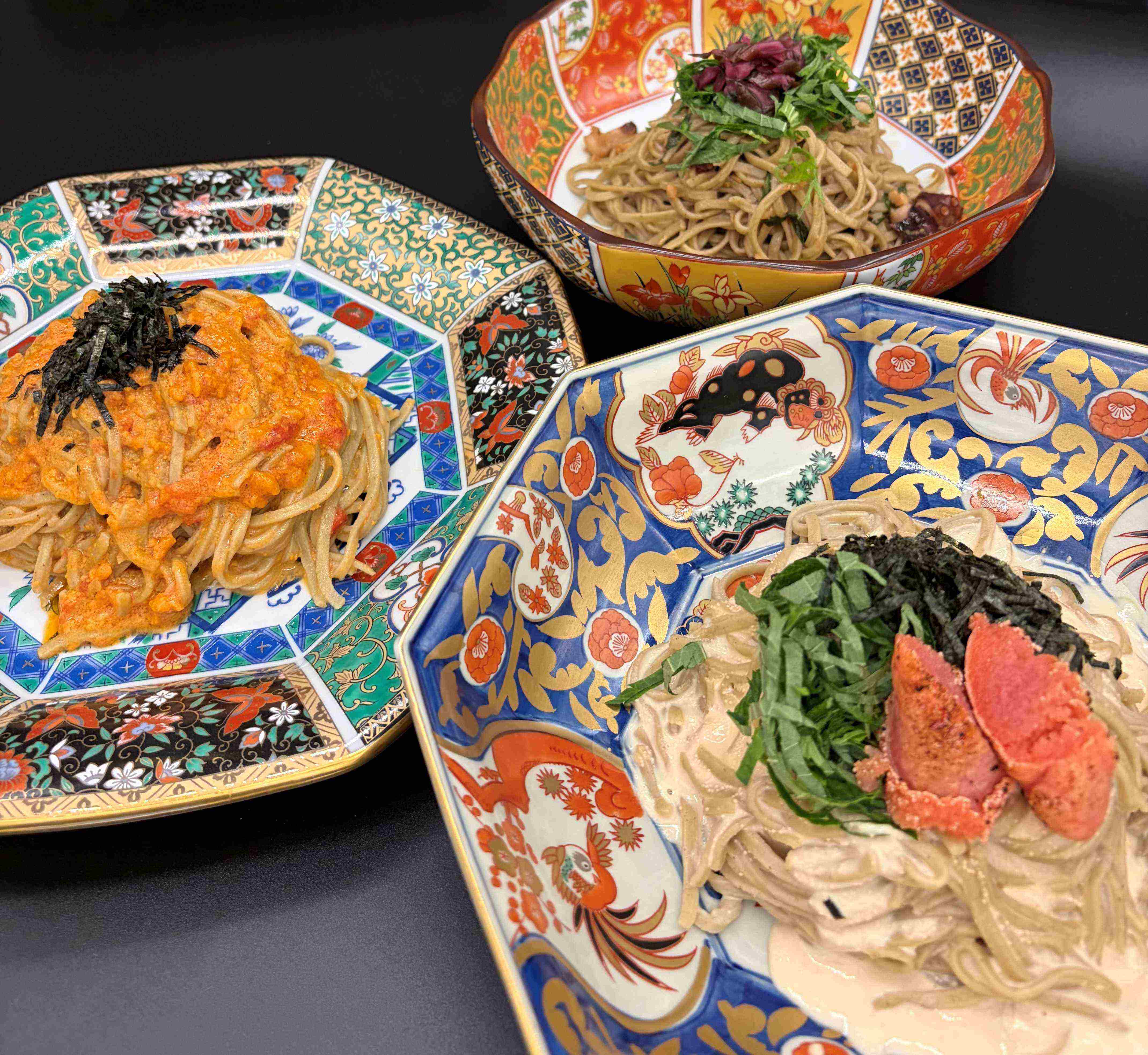 クリームやチーズ、イカスミといった洋の要素を取り入れた蕎麦をあえて和食器に盛り付けることで、伝統と革新が同居する独自の世界観を演出しています。