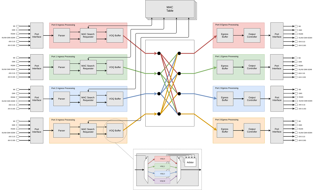 10Gマネージドイーサネット スイッチ(ME S)IPコアは、フルスピードのヘッドオブライン効果のないクロスバーマトリックスを備えており、すべてのポート間での連続転送が可能です。異なる回線速度で最大32個のポートをサポートします。スイッチは、ストアアンドフォワードスイッチングアプローチを実装して、フレームの整合性チェックに関するイーサネット標準ポリシーを満たします。