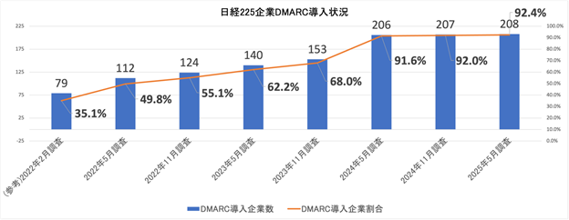 日経225企業は、2025年5月時点で208社(92.4%)が少なくとも1つのドメインでDMARCを導入しており、半年前の2024年11月(92.0%)からは0.4ポイントの増加であり、ほぼ横ばいで推移しています。