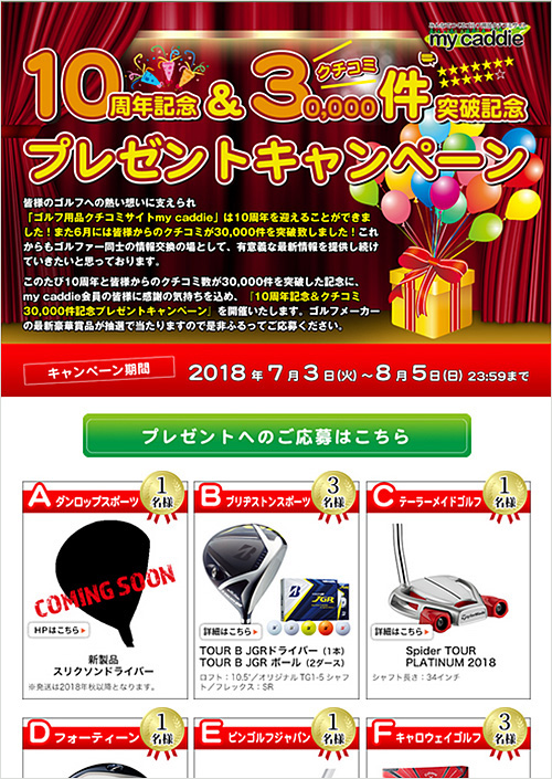 ゴルフ用品クチコミサイトmy caddie 『10周年&クチコミ3万件突破プレゼントキャンペーン』
