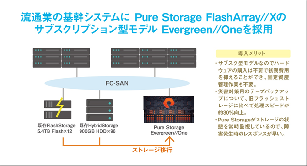 ITインフラのソリューション・ディストリビューターである株式会社ネットワールド(本社:東京都千代田区、代表取締役社長 芹澤 朋斉)は、キンドリルジャパン株式会社(本社:東京都港区、代表取締役社長 ジョナサン・イングラム)が手掛ける大手流通業の基幹システム向けストレージ基盤の刷新プロジェクトにおいて、Pure Storage社の高性能オールフラッシュストレージ「FlashArray//X」を、サブスクリプション型の提供方式である「Evergreen//One」で納入し、本格稼働開始したことを発表します。Evergreen//Oneを導入した国内初の事例となります。