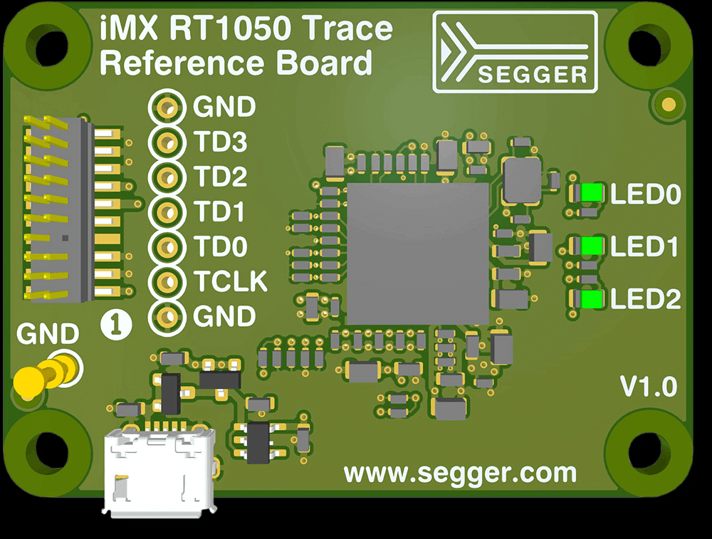SEGGER iMX RT1050トレースリファレンスボードは、ETM(Embedded Trace Macrocell)をサポートするARM Cortex-M7ベースのマイクロコントローラを備えたシンプルなハードウェアです。その主な目的は、命令追跡とライブコードカバレッジとプロファイリングのための参照プロジェクトをすばやく設定することです。