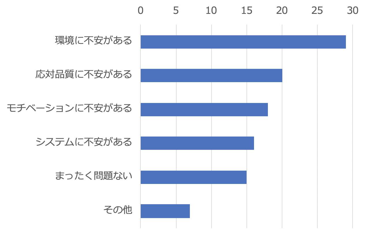 「環境に不安がある」ケースが多く、「対応品質」「モチベーション」「システム」と続きました。「その他」の理由にも「ネット環境が不安定になり、業務効率が下がった」といったシステム関連に起因する不安の声がありました。