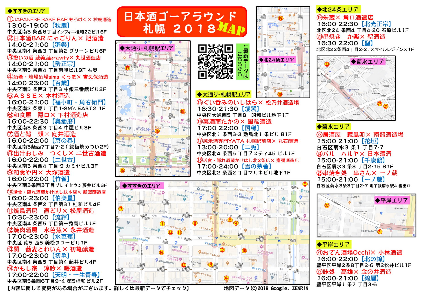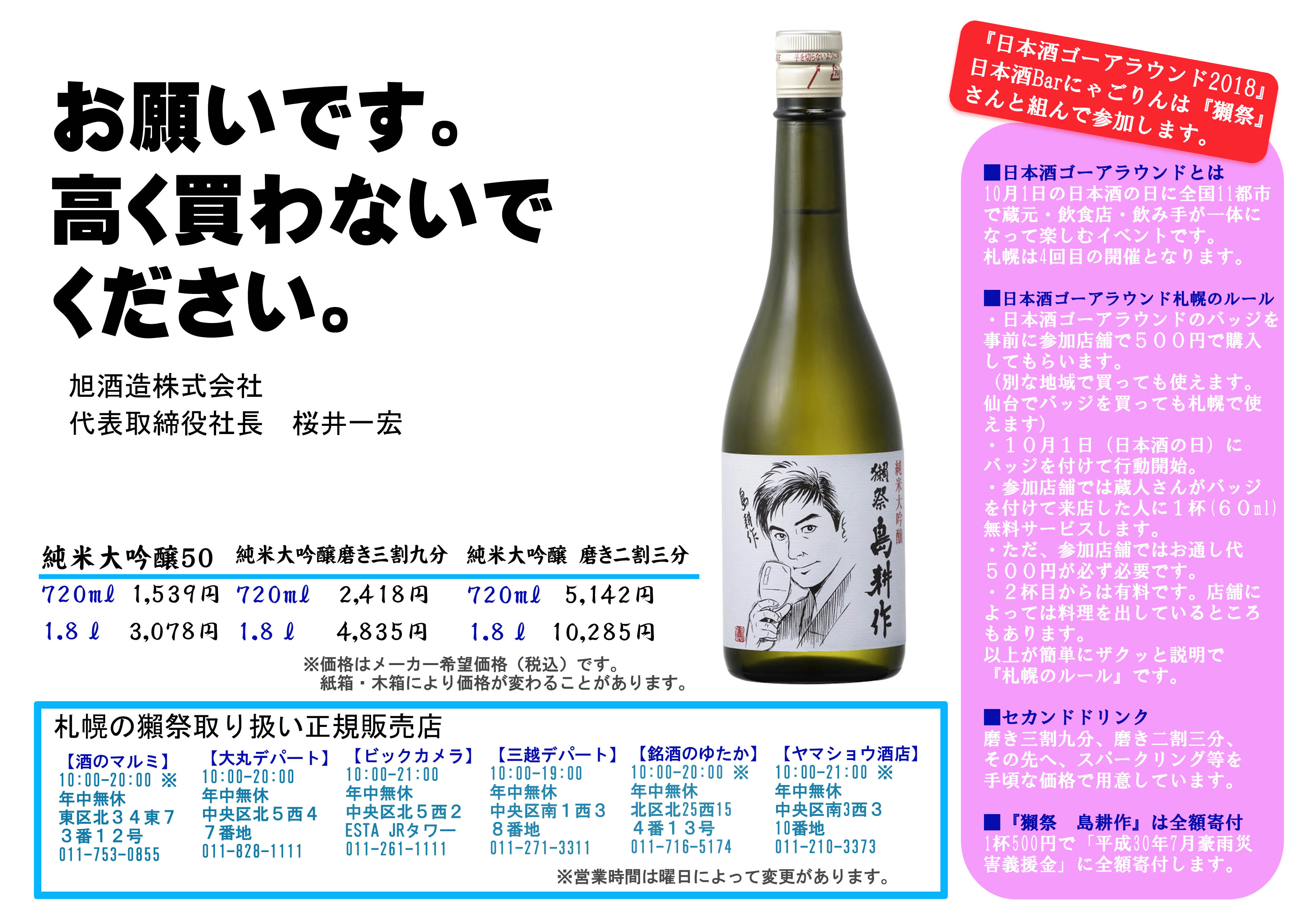 日本酒Barにゃごりん代表、小戸田由香は今年は『獺祭』と組んで酒を振る舞うほかに、店内では西日本豪雨の写真を展示いたします。「日本酒ゴーアラウンド2018」の札幌ではススキノ、札幌駅、北24条、菊水、平岸と会場は分かれますが全店制覇できる余裕のあるイベントになっています。1店舗最低500円掛かりますが、25店舗回れる札幌アスレチックです。缶バッジを付けていれば、どの都市の店舗でも飲み歩ける。まさに日本中をはしご酒で回る全国イベントです。 札幌は今年4回目で北海道日本酒普及団体 Kome Ezo 酒が運営を行っています。