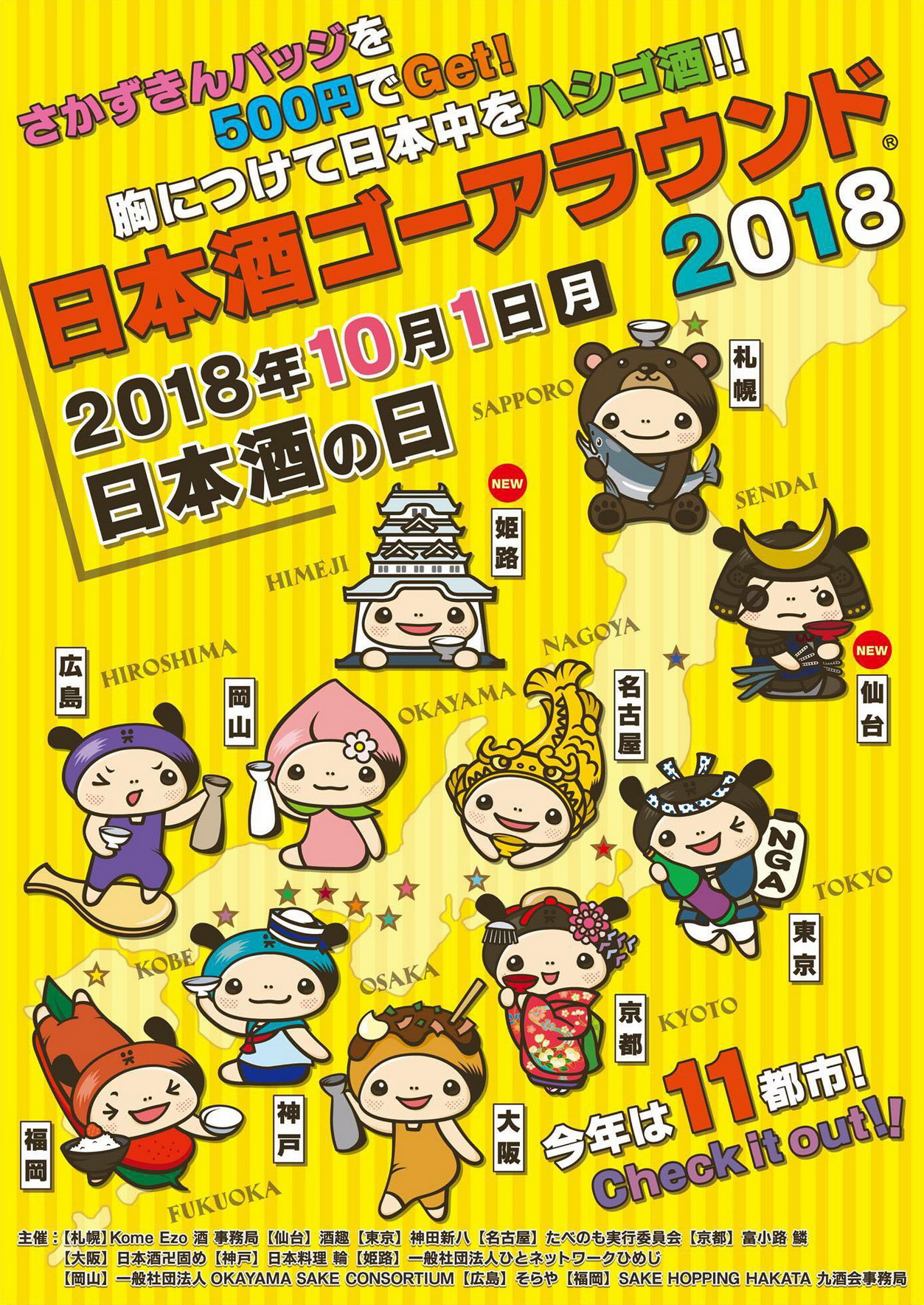 10月1日の「日本酒の日」を盛り上げ、日本酒の楽しさを伝えようと2008年に「日本酒卍固め」が大阪で始めた日本酒ゴーアラウンド(NGA)は2018年10月1日(月)日本酒ゴーアラウンドが11大都市(札幌、仙台、東京、名古屋、京都、大阪、姫路、神戸、岡山、広島、福岡)で同時開催されることが決定いたします。