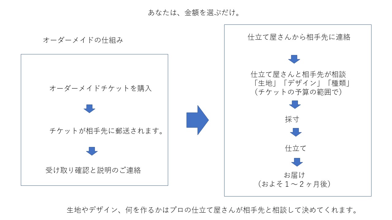 「敬老の日にプレゼントしたい。服は欲しいか聞いても欲しくないけど、貰うと嬉しい。でも何を選んでいいかわからない。」だから、送る側がプレゼントを選ばなくてよいサイトを作りました。予算に応じて注文すれば、オーダーメイドでプロが相手と相談してくれる。サイズもデザインもプロが相談しながら選んでくれるから間違いがない。ただ服が送られてくるのではなく、仕立て屋さんと相手との会話、服作りのプロセス、そして採寸から服が届くまで楽しみに待つ時間をプレゼントしませんか。