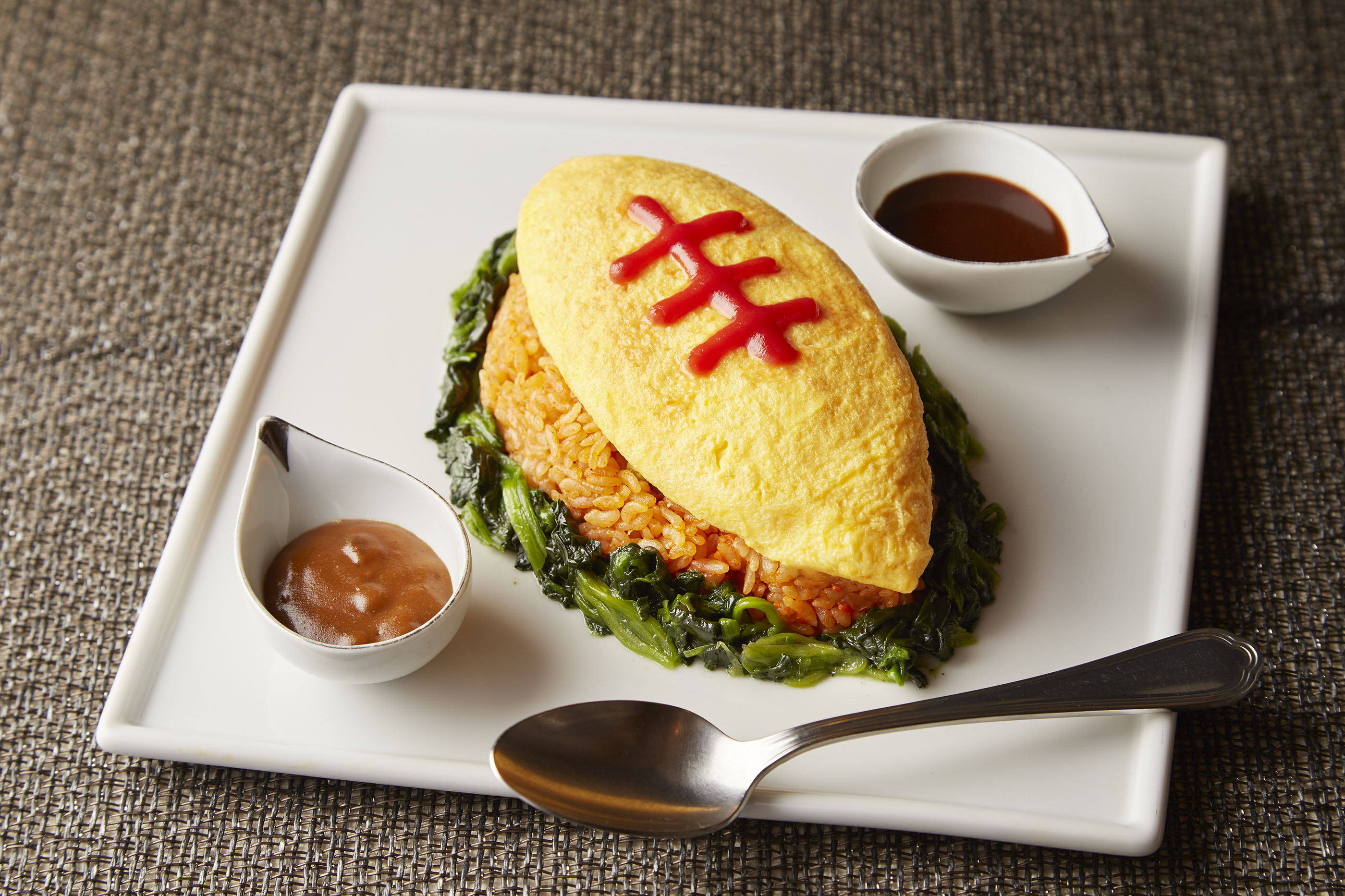 楕円形のラグビーボールとグラウンドの芝生をイメージし、贅沢に3個の卵を使ったオムライスです。