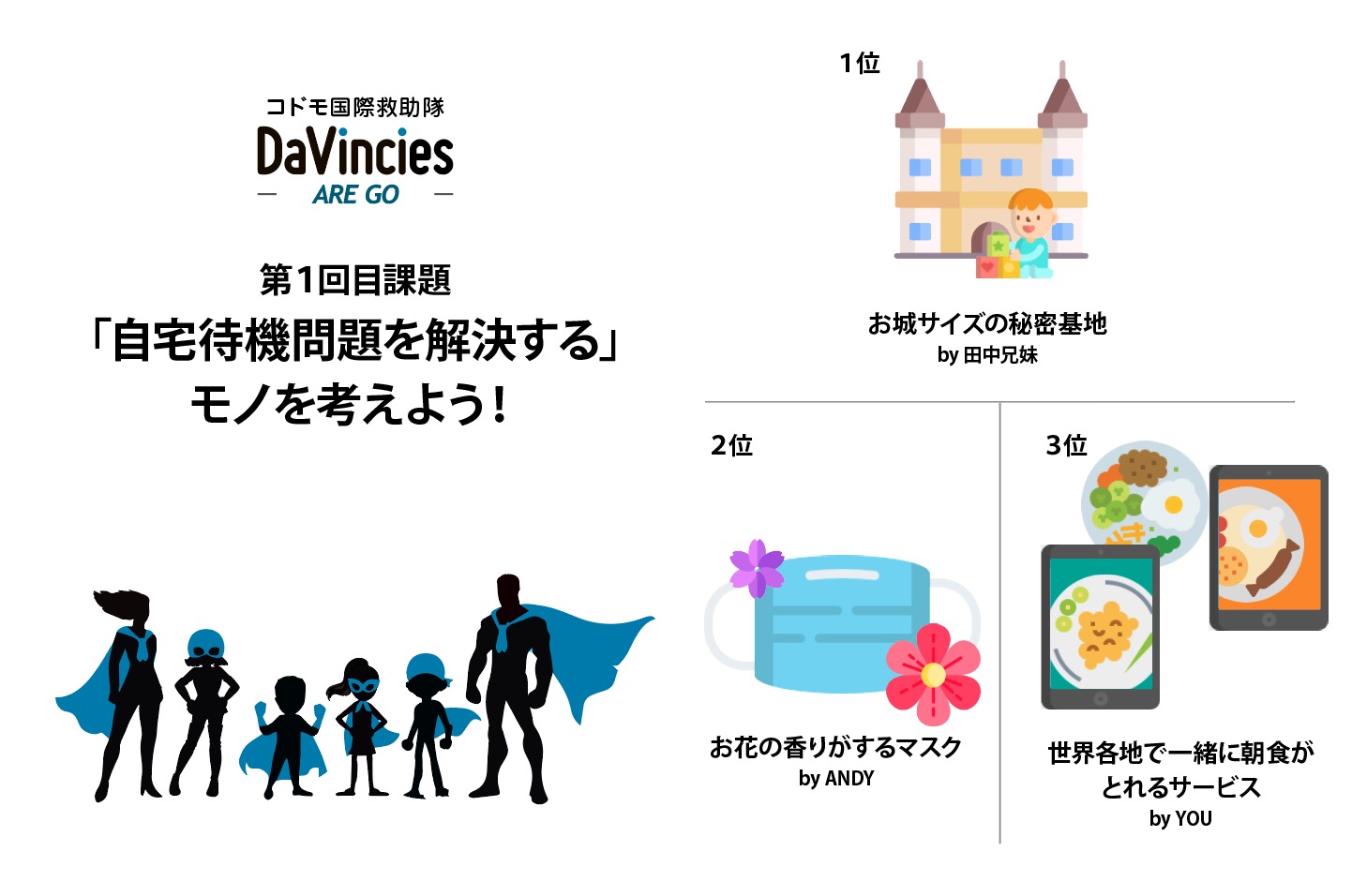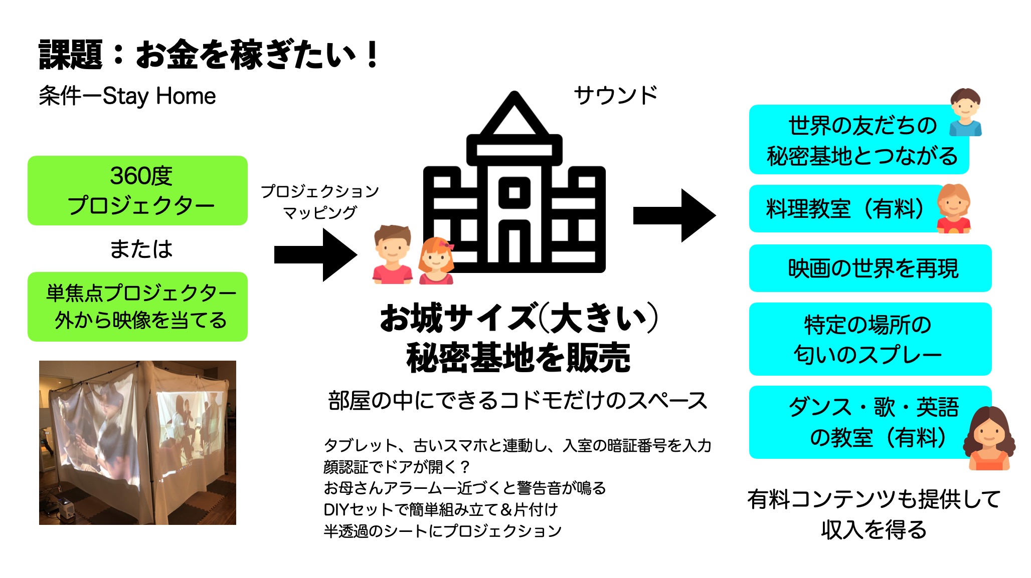 4月12日に行われた第1回目に取り組んだ課題は「自宅待機問題を解決しよう」。その中でも「お金を稼ぎたい」という意見が圧倒的に多く、その解決策として、「お城サイズの大きい秘密基地セット」を制作して販売。そこで展開するコンテンツはユーザーが提供できるという、プラットフォームのサービス案。もともとは一日中部屋にいて子どもが散らかしてしまう部屋をママに見られないようなものにしたいということからコドモ隊員が考えたアイデアです。コドモ隊員はすぐにそのイメージを描いたり、模型を制作。その場でダンボールハウスをつくって、中をトトロの世界観にしてくれた隊員もいました。