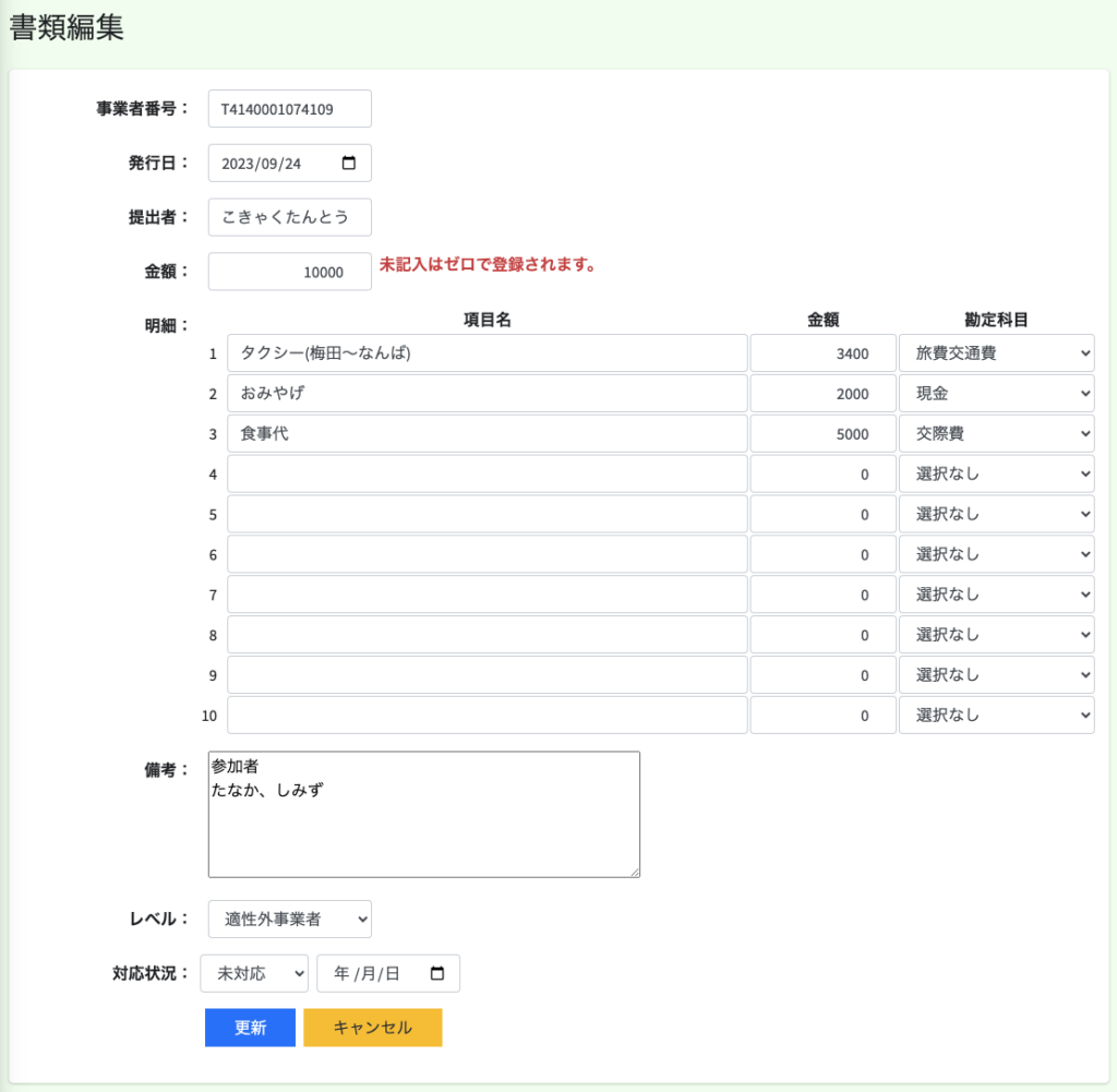 登録された情報に、金額などを追記することで、電子帳簿保存法で必要となる「事業者名/日付/金額」で検索ができます。