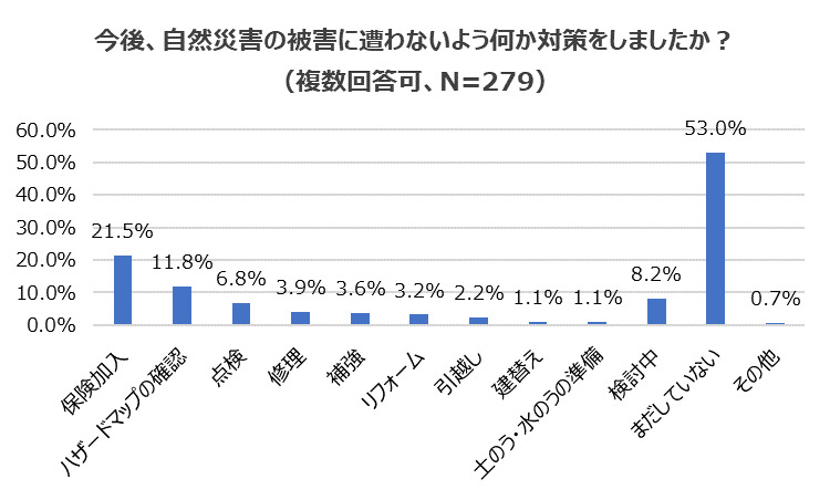 つぎに、「今後、自然災害の被害に遭わないように何か対策をしたか」たずねました。今年は深刻な台風被害が多い年でしたが、『まだしていない』(53.0%)が半分以上もいました。以下、『保険加入』(21.5%)、『ハザードマップの確認』(11.8%)、『検討中』(8.2%)、『点検』(6.8%)も決して多い数字とは言えません。
