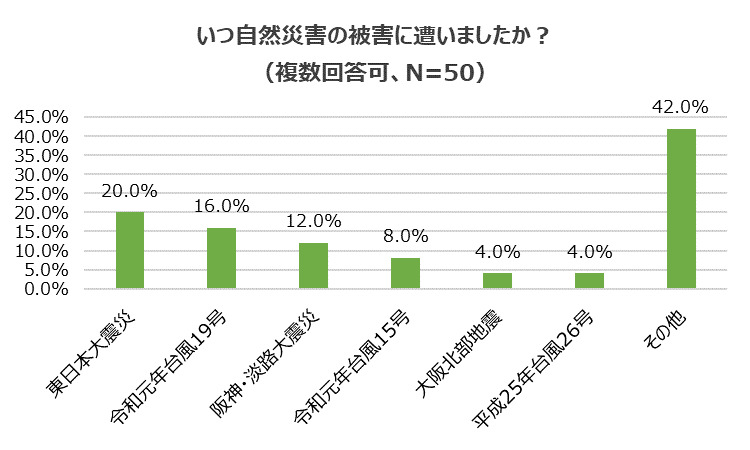 つぎに、「いつ被害に遭ったのか」たずねました。『東日本大震災』(20.0%)、『令和元年台風19号』(16.0%)、『阪神・淡路大震災』(12.0%)、『令和元年台風15号』(8.0%)、『大阪北部地震』『平成25年台風26号』(共に4.0%)、『その他』(42.0%)となり、今年の台風だけでも28.0%の人が被害に遭っていることがわかりました。
