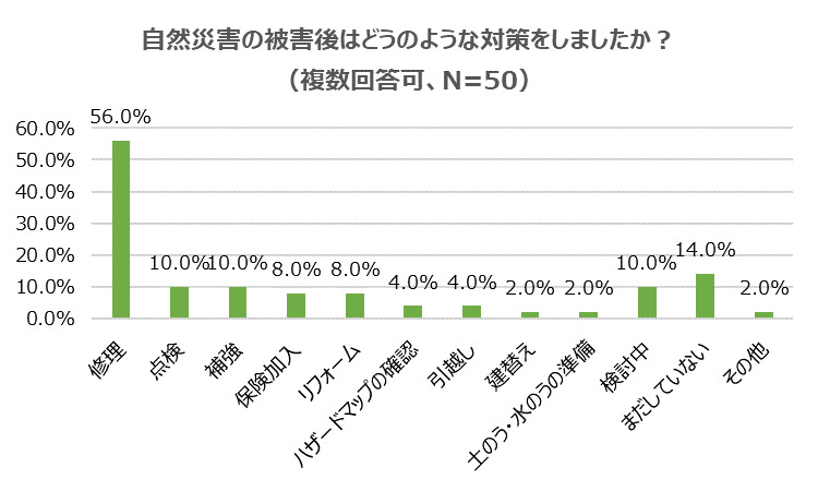 では、被害後はどのような対策をしたのでしょうか?『修理』(56.0%)が半分以上占め、『点検』『補強』(共に10.0%)、『保険加入』『リフォーム』(共に8.0%)となりましたが、『検討中』(10.0%)、『まだしていない』(14.0%)など、対策をしていない人が多いのも気になります。