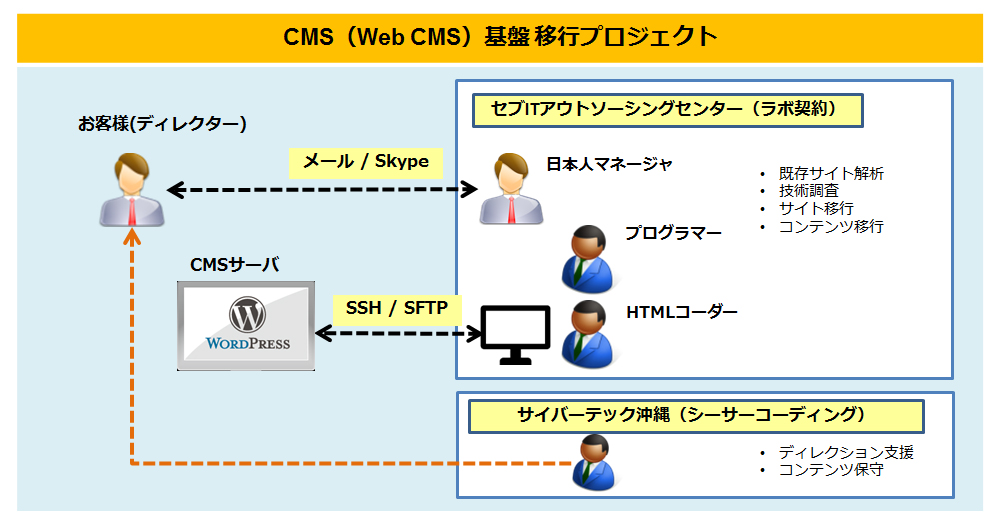 まず、サイバーテックの自社オフショア拠点である、セブITアウトソーシングセンターにて、調査・解析を約2か月実施し、不明点や疑問点をその期間でクリアにしました。調査・解析フェーズ終了後に移行スケジュールを立て、3か月で約500ページにも及ぶWebコンテンツの移行作業に取り掛かりました。旧CMSから新CMSのWordPressに元通りの構造を正しく確実に移す必要があるため、HTMLのコーディングスキルを持ったエンジニアをアサインして実施し、合計5カ月の初期プロジェクトは無事完了しました。結果として調査不足によるトラブルや、スケジュール遅延は発生せず、エンジニアの稼働工数も予定内でプロジェクトを完結する事ができました。