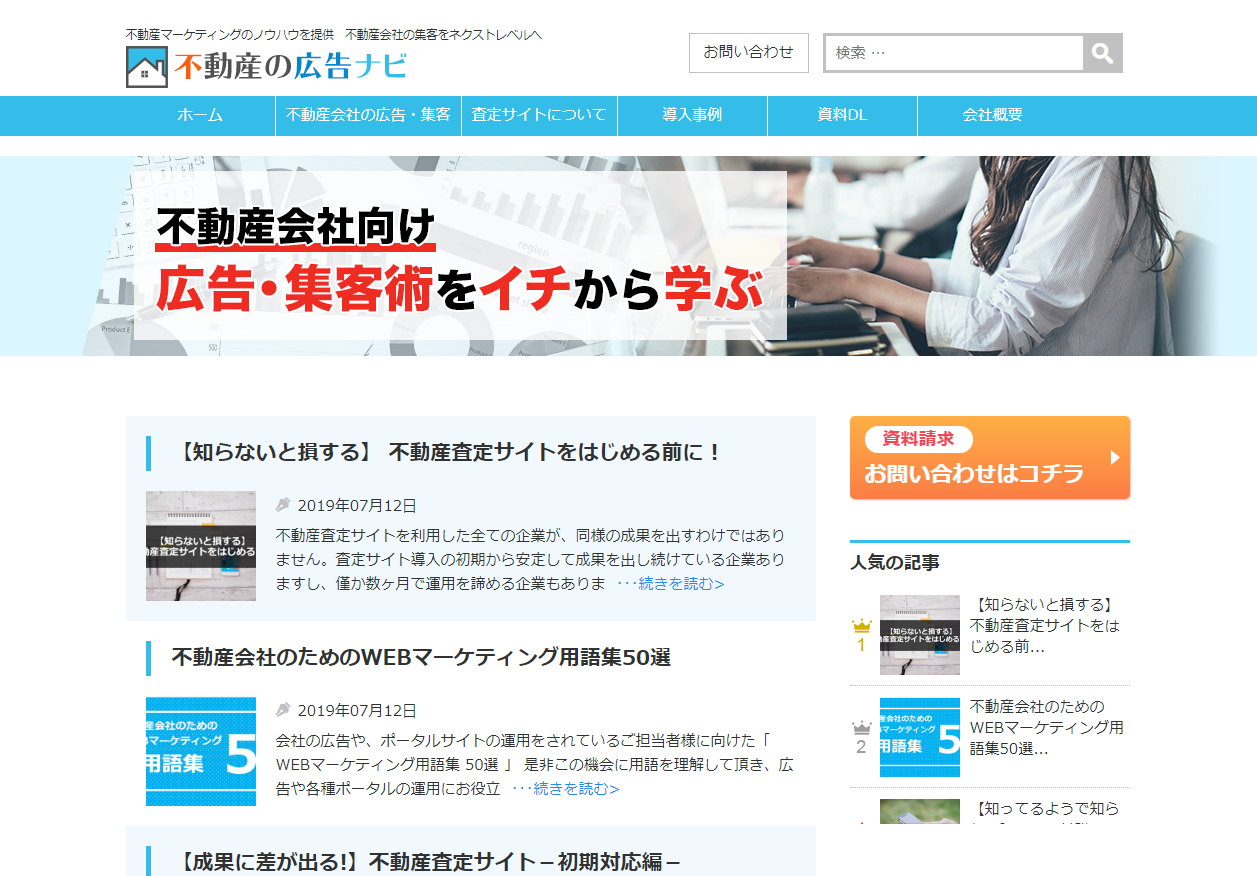 不動産会社向けに広告の使い方や集客術について役立つ記事を集約。さらに、査定サイトでの反響対応や営業効率のノウハウ、効果測定の重要度など、集客から成約に至るまでのノウハウを広義に教授します。