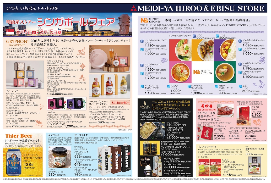シンガポール企業の発展を支援するシンガポール政府機関シンガポール企業庁(Enterprise Singapore)は、輸入食品などをそろえるスーパーマーケット「明治屋」とともに、「明治屋ストアー」の都内2店舗(広尾・恵比寿)にて「シンガポールフェア」をいよいよ8月9日(水)から開催いたします。シンガポールの建国記念日である8月9日(水)から8月15日(火)までの1週間、開催いたします。