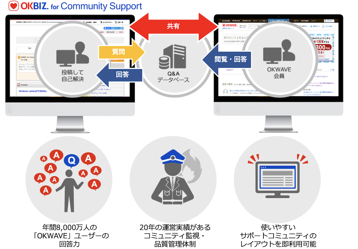 『OKBIZ. for Community Support』は繁忙期、ピークタイム、営業時間外、自社サポート範囲外のお問い合わせ等を顧客同士で問題解決する顧客参加型サポートコミュニティをサポートチャネルのひとつとして開設できるサービスです。年間約8,000万人が利用するQ&Aサイト「OKWAVE」との連携により、利用者が素早く回答が得られることや投稿監視等の負担なく導入できることが評価され、プリンター業界の国内大手企業全社をはじめ、PCやデジタル製品を扱う製造業やネットサービス業界などにて、ソーシャルチャネルを活用した先進的な顧客サポートソリューションとして導入が進んでいます(17サイト/2020年9月現在)。