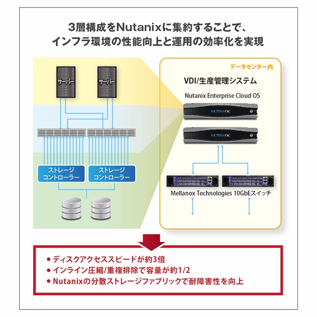 彫刻プラストは、先進ITシステムの活用に積極的で、十数年前から生産管理システムの仮想統合や社内クライアントのVDI化を実施してきました。3回目の更新となる今回のプロジェクトでは、性能の改善、信頼性・耐障害性の向上、BCP強化を目的とし、Nutanix Enterprise Cloud OS搭載の3ノードからなる 「Nutanix NX-1065」が導入され、7台の業務サーバーと約50台の仮想デスクトップが集約されて、本格稼働開始しました。