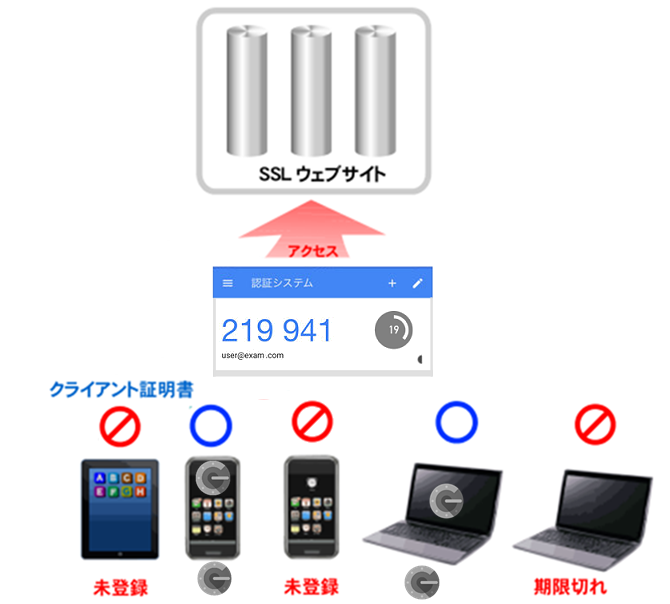 ワンタイムパスワードとしては、Google Authenticator の形式に対応しています。利用者側では、Google Authenticator 形式に対応の無償のソフトウエア・トークン(ワンタイムパスワード発生器)を利用することで、導入費用を抑えてスマフォやモバイル端末、PCなどからワンタイムパスワード認証の機構を利用することが出来ます。SSLクライアント認証については、正規のSSLクライアント証明書を持つユーザーのみにWebサイトへのアクセスを許可させる運用が出来ます。Webサイトやディレクトリ毎に、2つの認証機能の併用や用途や利用者に合わせて、それぞれの単独認証などでの運用に対応しています。