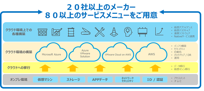 多様なデータ、アプリケーション、仮想マシン、ネットワーク、セキュリティなど、既存のオンプレミス環境のクラウドへの移行を支援