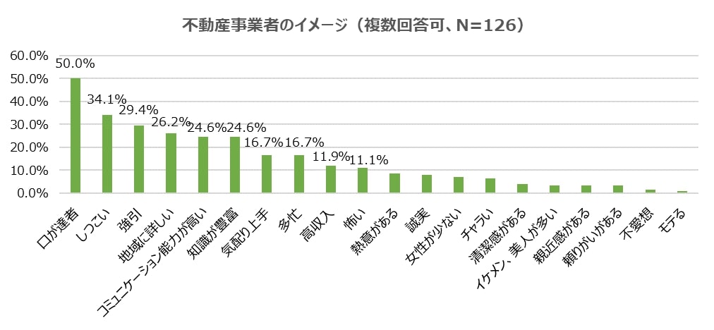 リビンマッチの利用者に「不動産事業者のイメージ」をたずねたところ、1位『口が達者』(50.0%)、2位『しつこい』(34.1%)、3位『強引』(29.4%)、4位『地域に詳しい』(26.2%)、5位『コミュニケーション能力が高い』『知識が豊富』(共に24.6%)、以下『気配り上手』『多忙』(共に16.7%)、『高収入』(11.9%)、『怖い』(11.1%)という結果になりました。