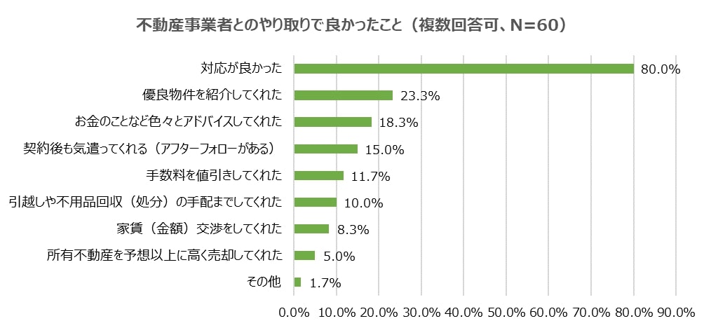 つぎに「不動産事業者とのやり取りで良かったことはあるか?」たずねたところ、『ある』(47.6%)、『ない』(52.4%)でした。では、『ある』と回答した人はどのようなことが良かったのでしょうか? 1位は『対応が良かった』(80.0%)となり、ほとんどの人が担当者の対応の良さを求めていることがわかりました。2位は『優良物件を紹介してくれた』(23.3%)、3位『お金のことなど色々とアドバイスしてくれた』(18.3%)、4位『契約後も気遣ってくれる(アフターフォローがある)』(15.0%)となり、担当者のちょっとした気遣いにより、さらなる好印象を持つこともわかりました。このことから、不動産事業者は、ある意味客商売であることも推測されます。
