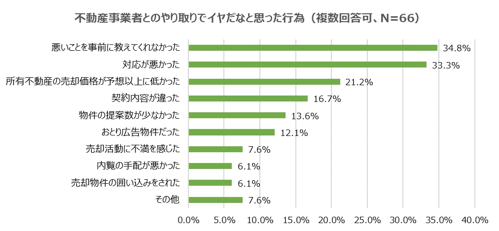 つづいて、「不動産事業者とのやり取りでイヤだなと思った行為はあるか?」たずねました。『ある』(52.4%)、『ない』(47.6%)となり、半数以上の人が不快な思いをしていることもわかりました。『ある』と回答した人に、どのような行為が不快かたずねたところ、1位は『悪いことを事前に教えてくれなかった』(34.8%)でした。これは、トラブルに発展しやすく、不動産事業者への信頼をも失ってしまう可能性があるため、早急に改善が必要ではないでしょうか。2位は『対応が悪かった』(33.3%)、3位は『所有不動産の売却価格が予想以上に低かった』でした。また、4位の『契約内容が違った』や、『その他』では「騙された」「言っていることが嘘」などの回答があり、担当者が正確な情報を適切に伝えていないことで、このような結果を生み出しているようです。