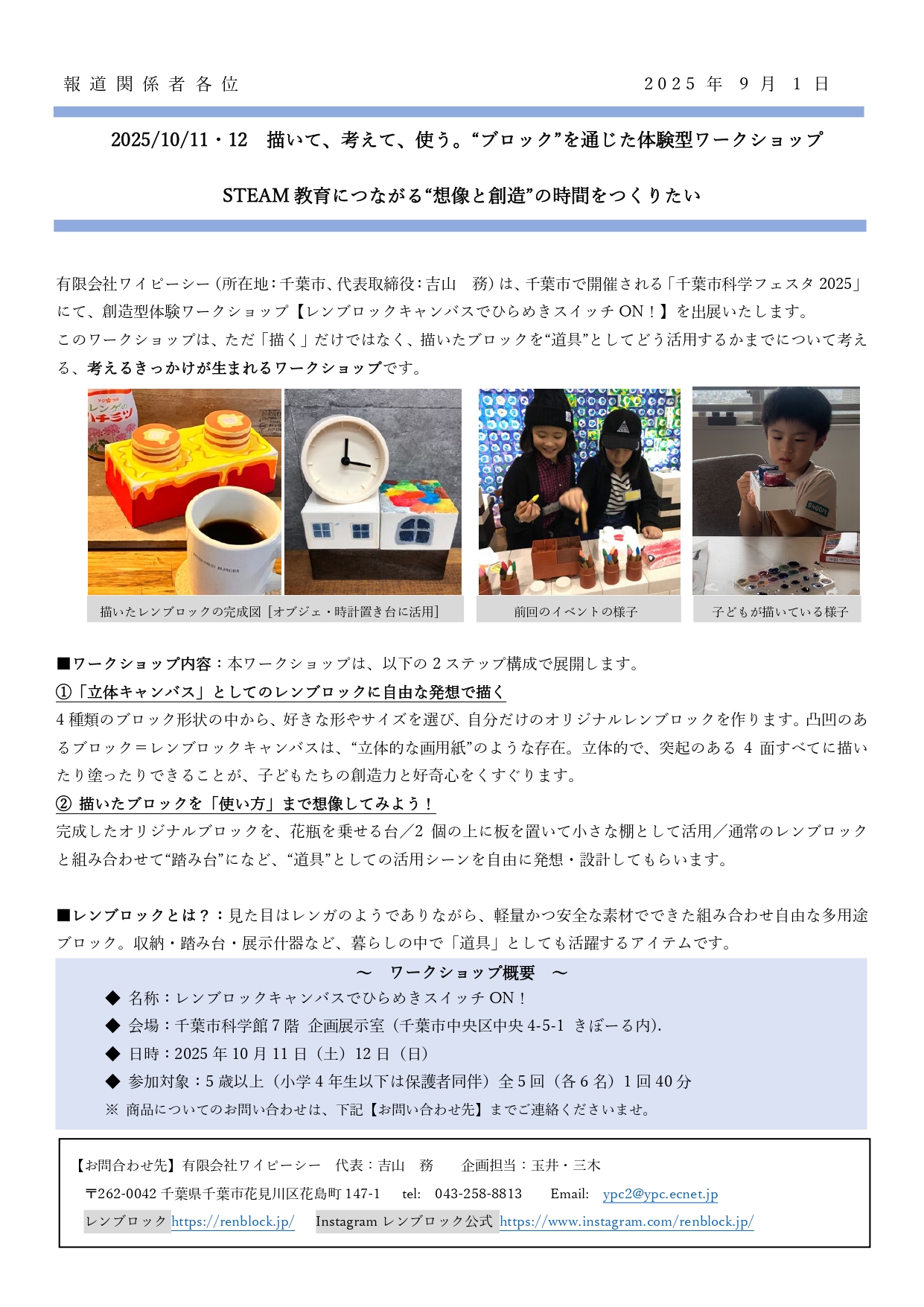 有限会社ワイピーシー(所在地:千葉市、代表取締役:吉山 務)は、千葉市で開催される「千葉市科学フェスタ2025」にて、創造型体験ワークショップ【レンブロックキャンバスでひらめきスイッチON!】を出展いたします。