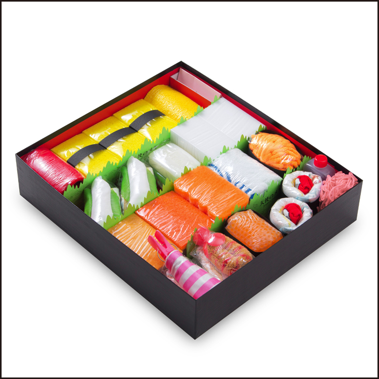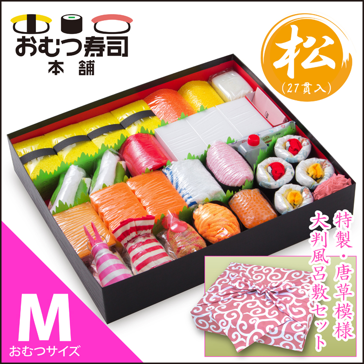 シャリ部分は“おむつ”、ネタ部分には、今治タオルを用いてマグロ、よだれかけ(スタイ)を用いてエビ、ベビーソックスを用いて鉄火巻き、保冷剤を用いてイクラなどの寿司ネタを模し、ガリ・バラン・折り箱・風呂敷等の付属物も付いている。サイズはシャリにおむつを使っているので当然、一回り以上も大きいが、寿司折りと見まごう完成度に思わず笑みがもれる出産祝いギフト。受け取ったものは、まずそのインパクトに「何これ?」と驚き、おむつを使ったお祝いであることに悦び、さらに各々のネタの緻密さに感心するサプライズギフトになっている。