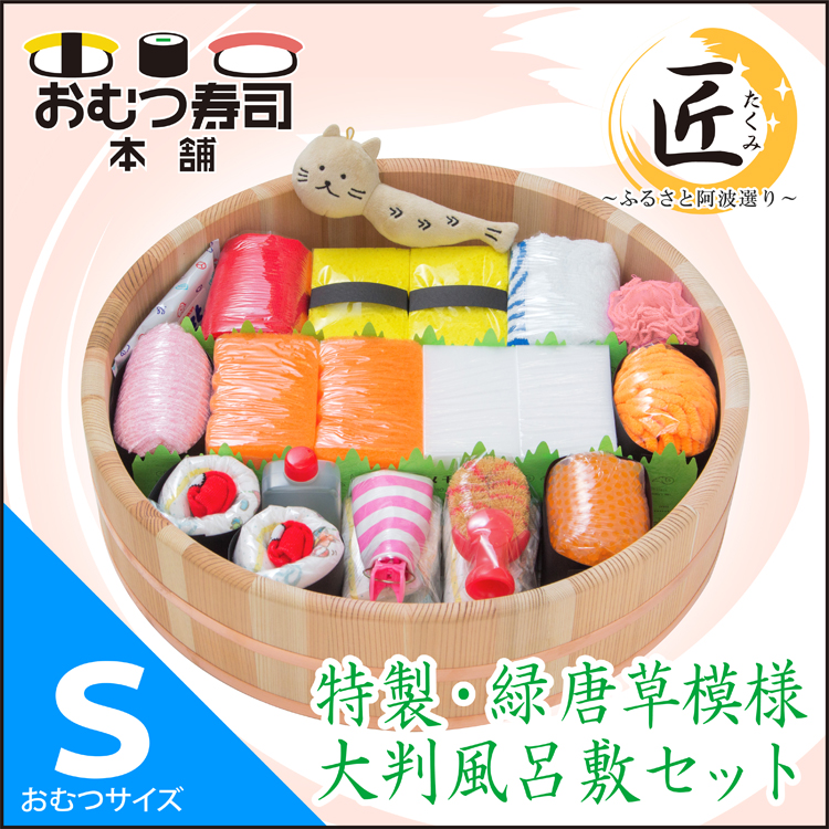 『おむつ寿司』は、地方特化型・育児情報誌「ワイヤーママ」をはじめ、徳島タウン情報誌「あわわfree」「Geen」等を発行する株式会社あわわ(所在地:徳島県徳島市、代表取締役社長 岩佐乃介)が販売する出産祝いギフト。お寿司をモチーフに、シャリはおむつ、ネタは育児グッズを中心に構成した、日本版おむつケーキだ。『おむつ寿司』の発売から5周年を迎えた記念として、お祝いに縁起の良い唐草模様のラッピング用大判布風呂敷(唐草/緑・桃)[価格1,000円]を先着105名にプレゼント(対象商品購入者)するキャンペーンを開催。おむつ寿司同様、一つひとつ手作業で丁寧に作られた風呂敷は、1辺が約1メートルもの特注サイズで、いっそうのインパクトと高級感を演出する。またラッピングとしてだけで無く、さまざまな用途で有効活用できると好評を得ている。