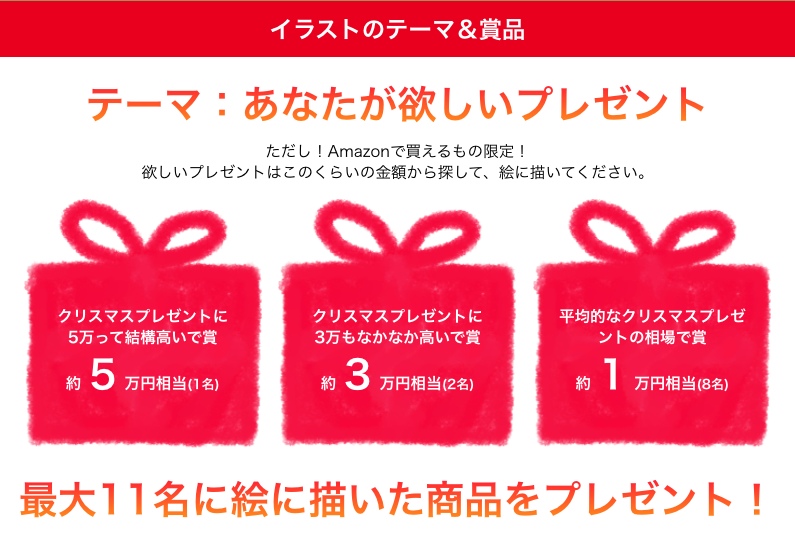 詳しく説明すると、Amazonに売っているあなたが欲しい商品を絵に描いて、Amazonのリンクを添えて、その商品がどれだけ欲しいかとか、最近あった悲しい出来事などを思う存分書いて、キャンペーン開催中の100時間の間に投稿すると、絵に描いたプレゼントがもらえるかもしれないキャンペーンです。