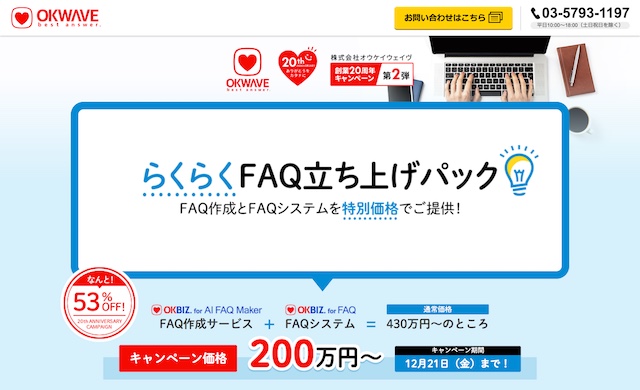 日本初、最大級のQ&Aサイト「OKWAVE」(https://okwave.jp)を運営する株式会社オウケイウェイヴ(本社:東京都渋谷区、代表取締役社長:松田 元)は、AIがFAQの作成を自動で支援するソリューション「OKBIZ. for AI FAQ Maker」と、FAQ運用を一元管理できるFAQシステム「OKBIZ. for FAQ」をセットにして、特別価格にて提供するオウケイウェイヴ20周年記念キャンペーン第2弾『らくらくFAQ立ち上げパック』の提供を2018年11月15日(木)〜12月21日(金)の期間限定にて実施します。