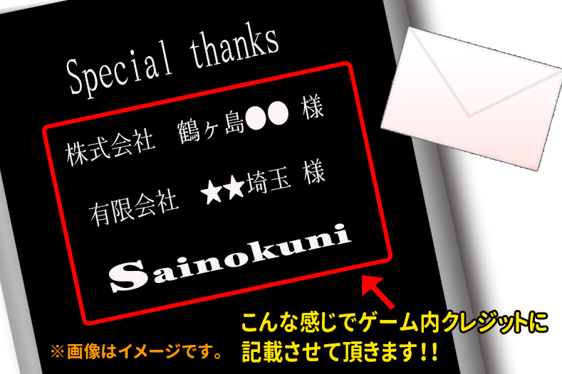 ゲーム内のクレジットや、ホームページ内にてSPサンクスとして協賛社・団体様のHPへのリンク付きバナーを掲載させて頂きます。
