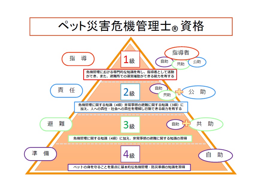 本資格では、緊急時に取るべき行動や知識レベルに応じてペット災害危機管理士(R)4級から1級まで、4段階を設定しています。級が上がる毎に知識だけでなく取るべき行動や瞬時の判断力、また、グループを束ねた救助活動を行うための実務能力や避難から復旧・復興に至る過程での様々な被災者(飼い主)とペットへのサポートも身に付くように設定されています。