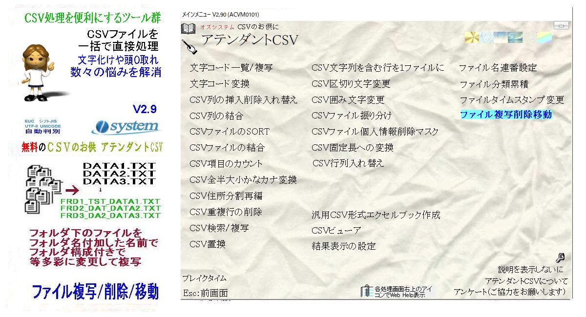 CSV処理をより便利にする無料ツール集「CSVのお供 アテンダントCSV」をバージョンアップ。ファイル複写削除移動をリリース