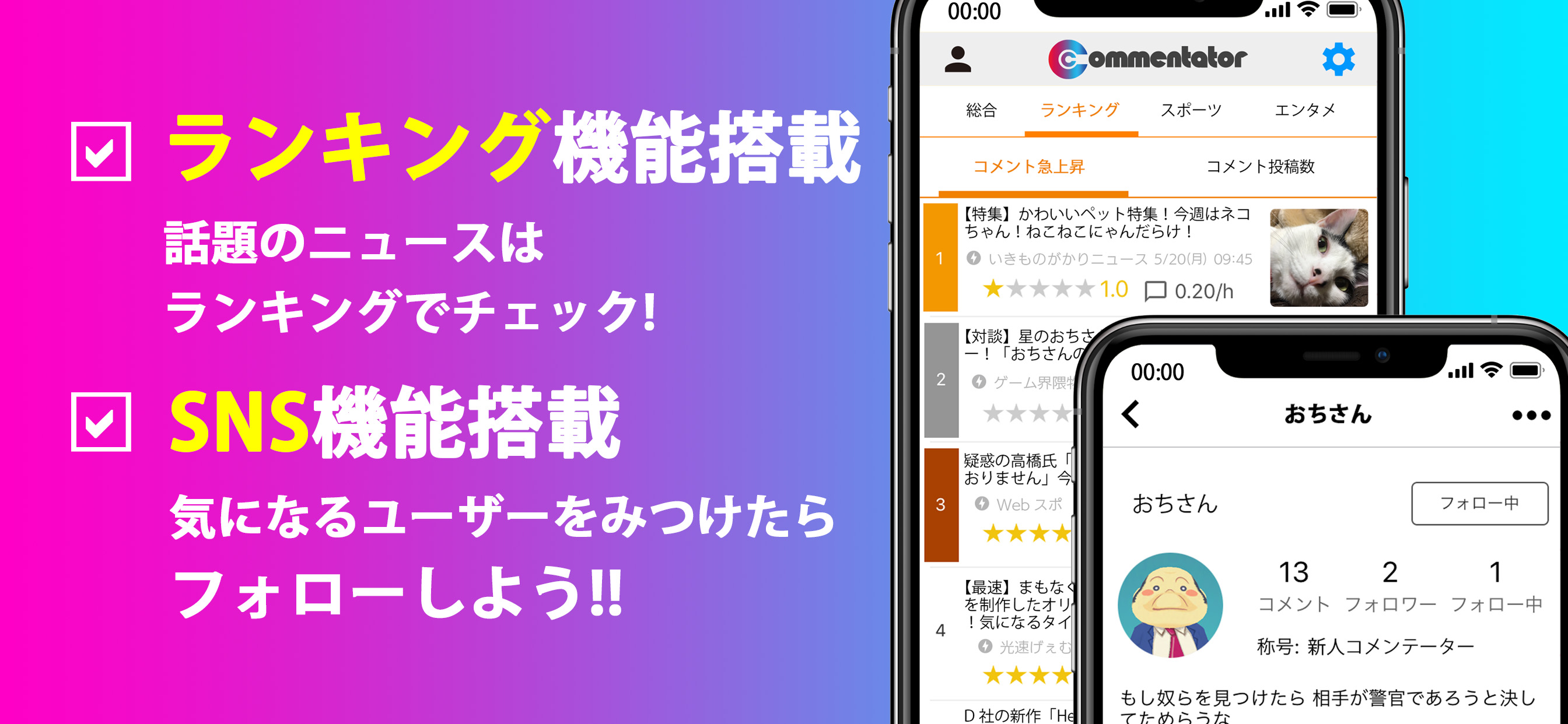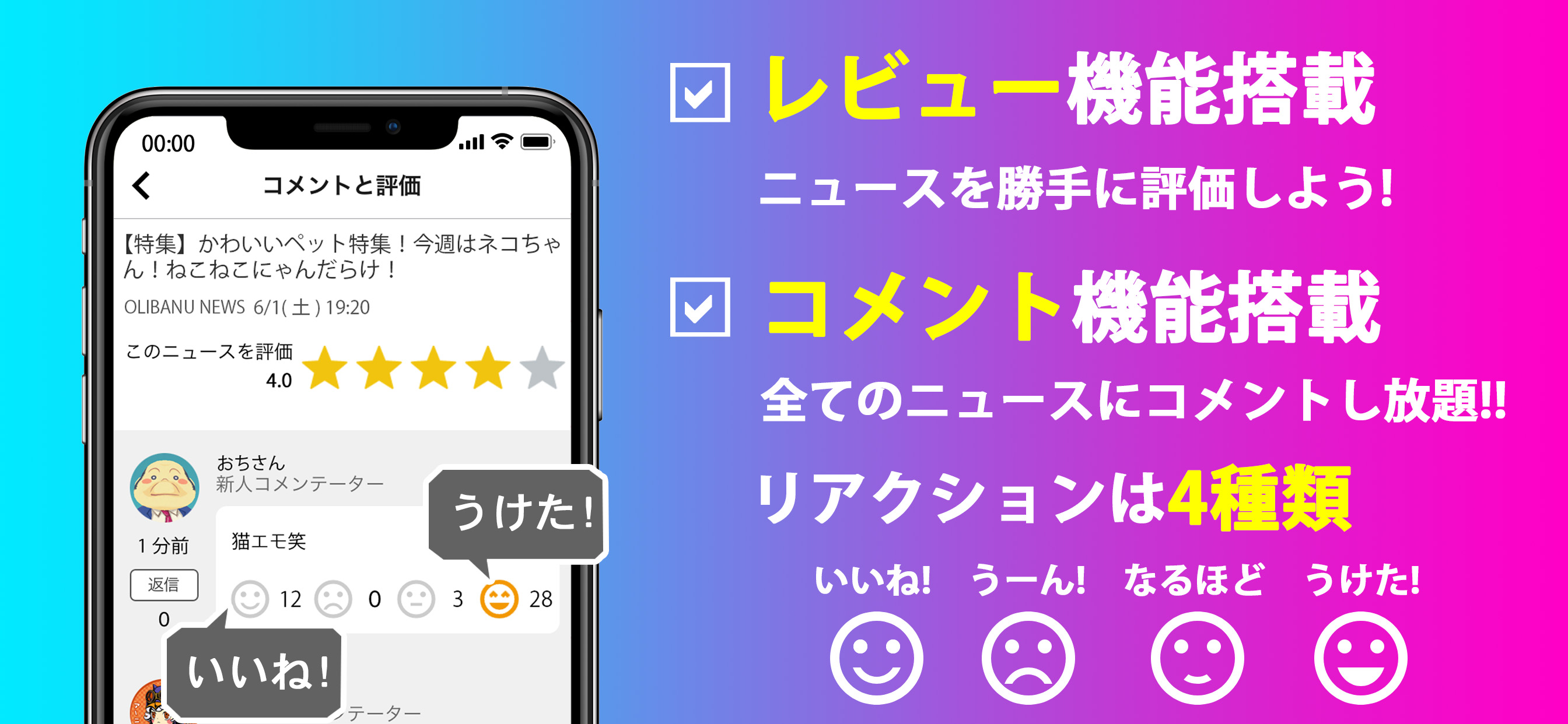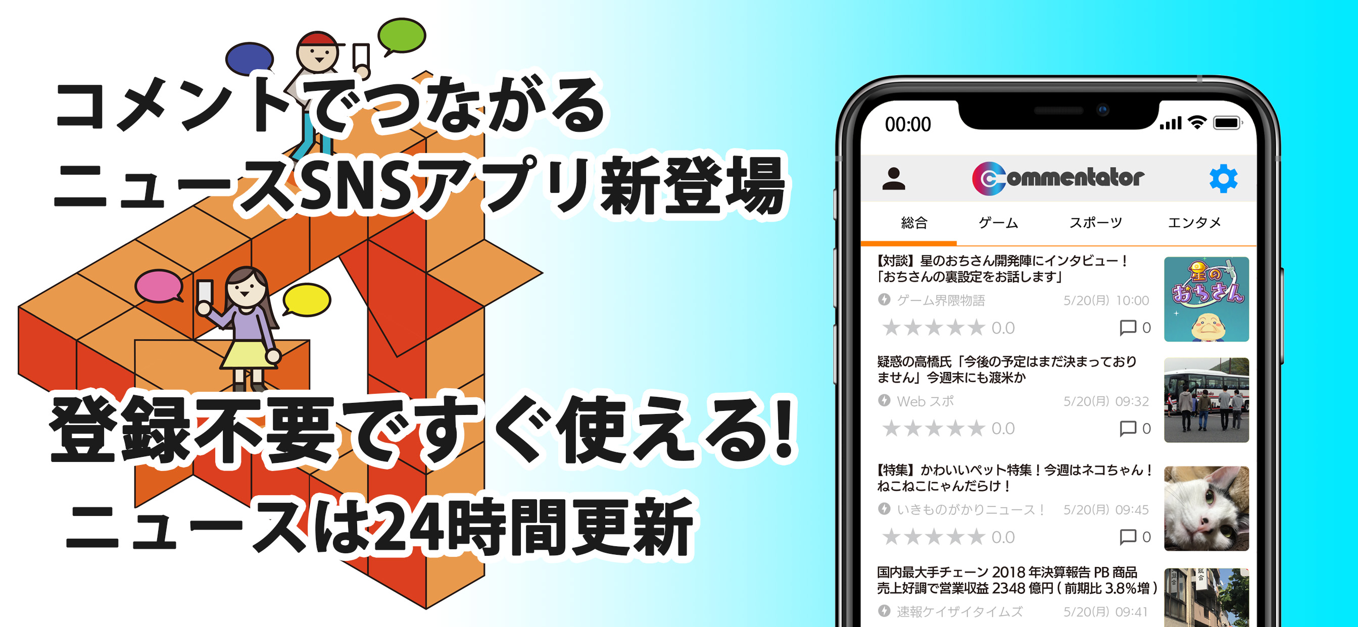 コメントでつながるニュースRSSリーダーアプリCommentator(コメンテーター)は、ニュースやブログの最新情報をRSSで収集し一覧で表示、そのすべての記事にコメント投稿ができるアプリです。