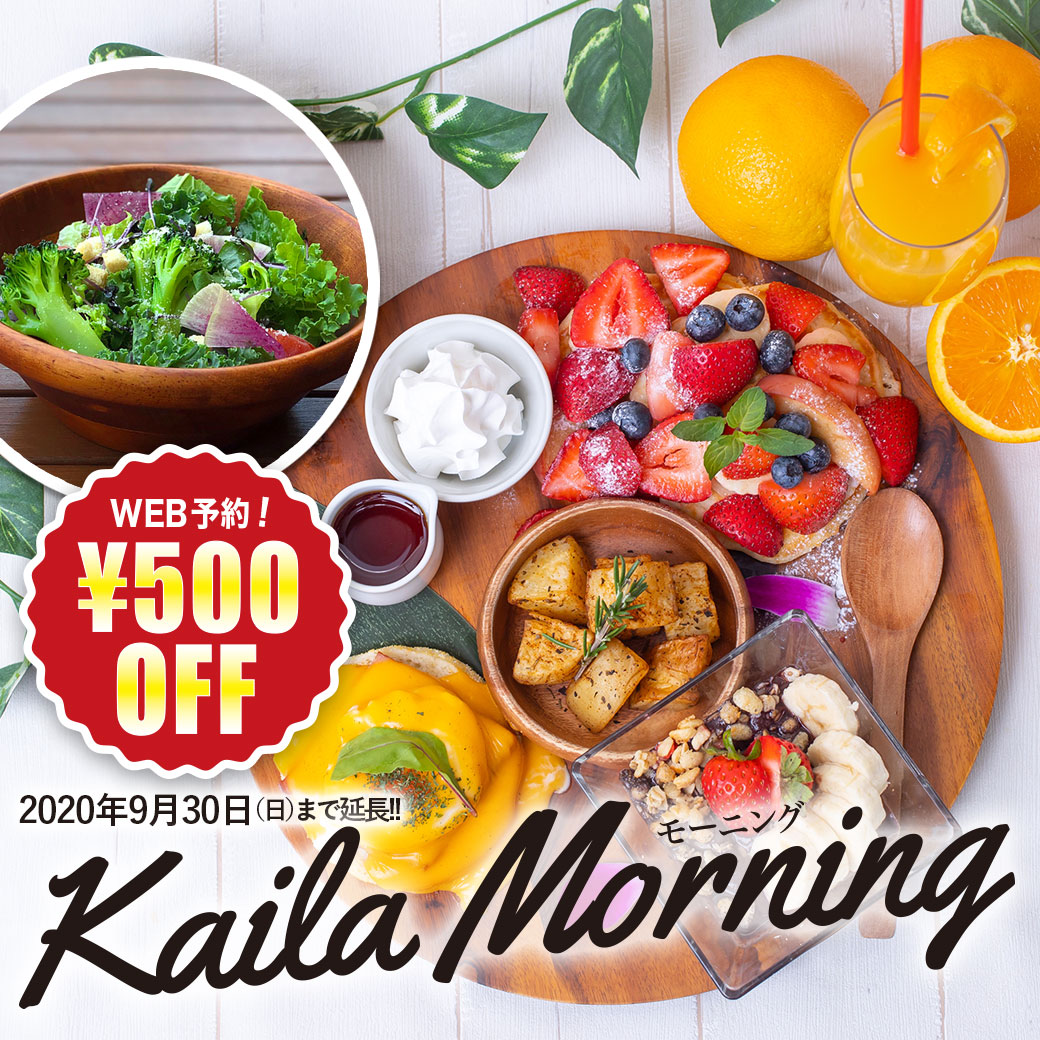 渋谷モディ9階にある「カイラ カフェ&テラスダイニング 渋谷店」で好評いただいておりました、モーニングキャンペーンが9月末まで延長!!暑い夏を元気に過ごしていただくため、人気のパンケーキをはじめトロピカルメニューが盛り沢山の絶品モーニングを通常2,300円(税別)→1,800円(税別)でご提供!さらに、3日前までにネットでご予約いただいた方に、1グループにお食事券1,000円分プレゼント致します!!カイラの栄養満点モーニングで、暑い夏を楽しく元気に乗り切りませんか?