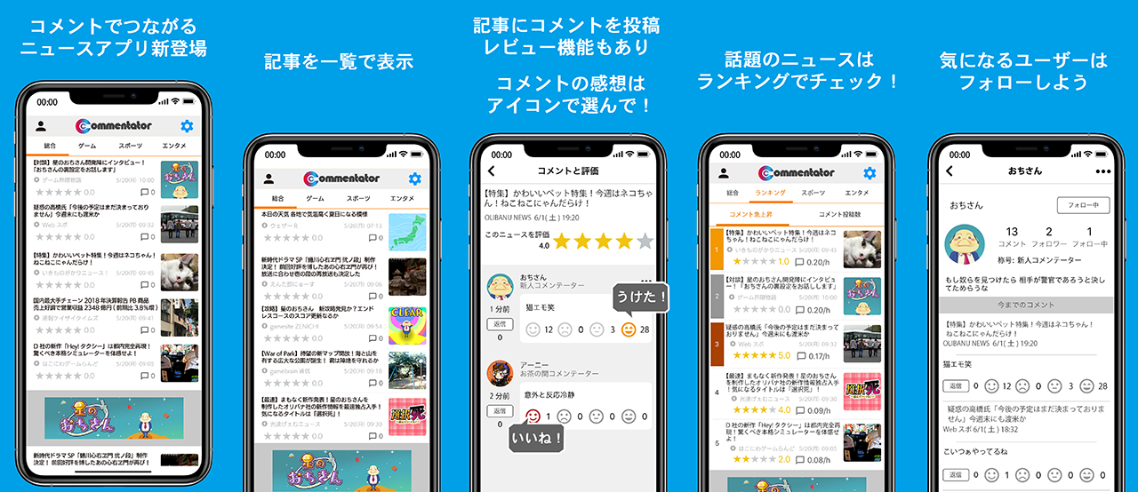 コメントでつながるニュースRSSリーダーアプリCommentator(コメンテーター)は、ニュースやブログの最新情報をRSSで収集し一覧で表示、そのすべての記事にコメン投稿ができるアプリです。