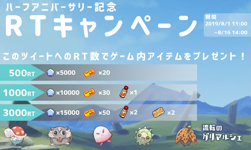 「流転のグリマルシェ」公式Twitterの指定ツイートのRT数に応じて、ユーザーの皆さまにプレゼントする、ハーフアニバーサリー記念RTキャンペーンを開催いたします。