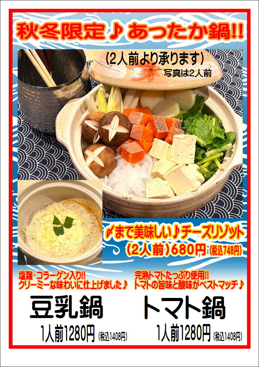 ・期間限定の鍋料理2品、熱々の「トマト鍋」「豆乳鍋」
