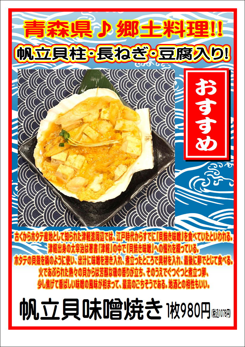 ・期間限定の「帆⽴⾙味噌焼き」、⻘森の地酒「⽥酒」とともに