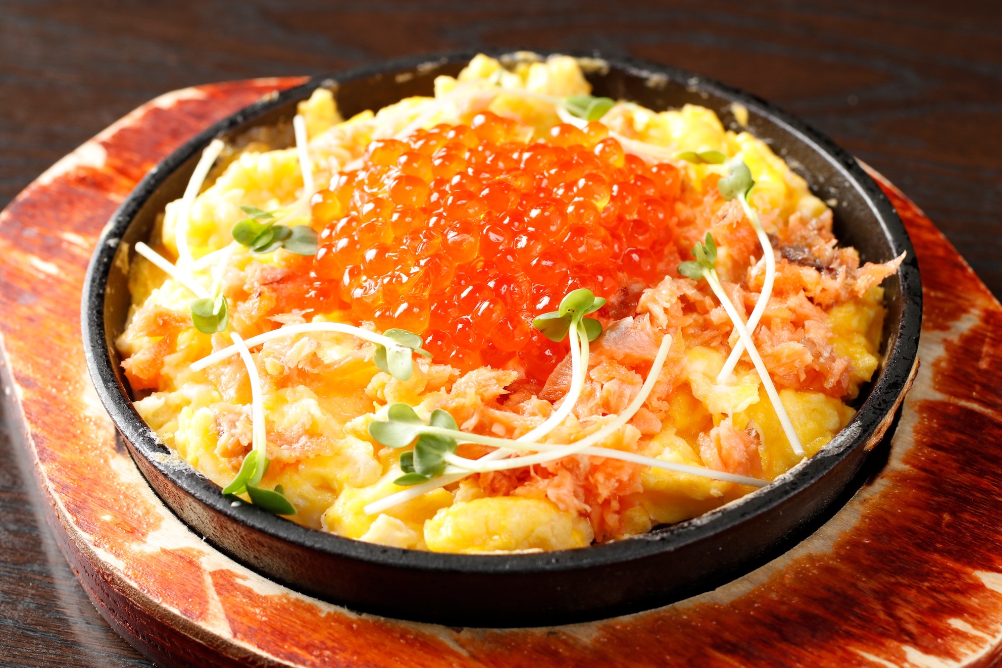 熱々の鉄板で提供されるふわふわの⽟⼦焼き。イクラの旨みが⽟⼦を包み込みます