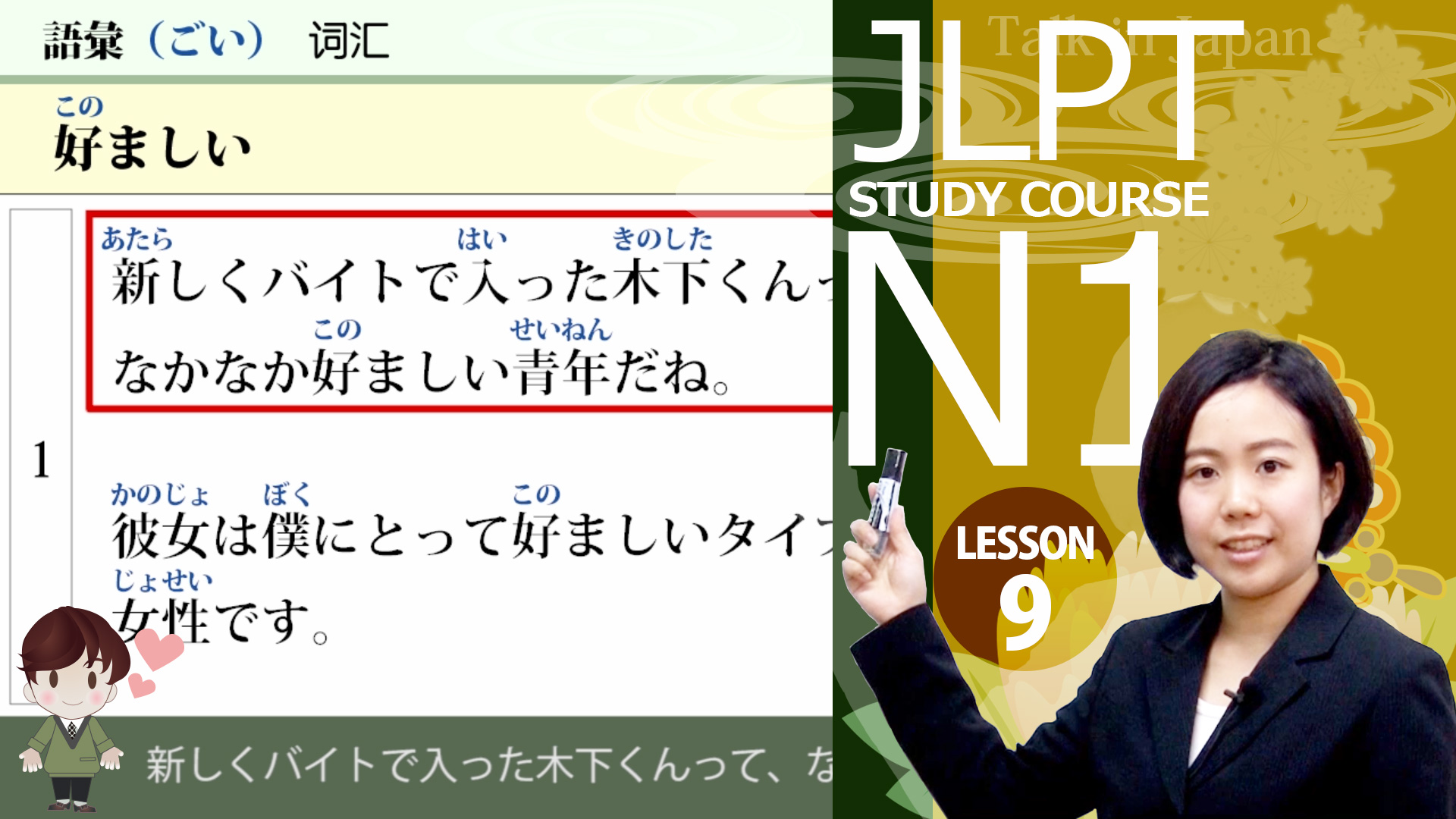 上級日本語学習者に向け、ナレーションは全部日本語字幕付いています。中国語のテキストも用意しておりますので、わからないところがあれば、テキストにご参考ください。この教材は日本語を母国語としない人を対象にしています。一般の上級日本語学習者でも、上級のビジネス日本語を勉強したい学習者でも、日本語能力試験N1の受験生にもご利用いただける教材になっております。日本語の学習能力の向上、日本語能力試験N1語学資格の取得、上級ビジネス日本語の習得に役立ちます。日本国内外の日本語学校、大学、日系企業の外国人社員日本語研修に最適な教材になっております。