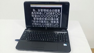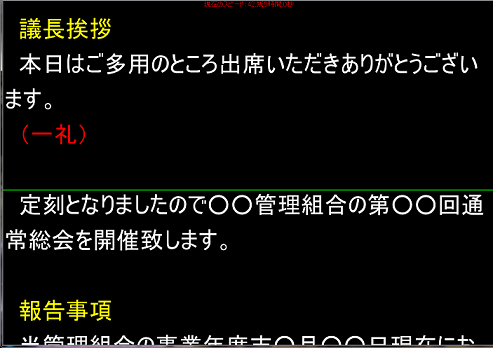 事前にお打ち合わせをさせて頂き、どのように表示すべきか、演説者はどのくらいの文字の大きさが見やすいか、株主総会の途中で一度議長に席に着いてもらうシーンがあるがどのように表示したらよいか、など状況に応じたご相談を踏まえ、原稿を作成させていただきます。