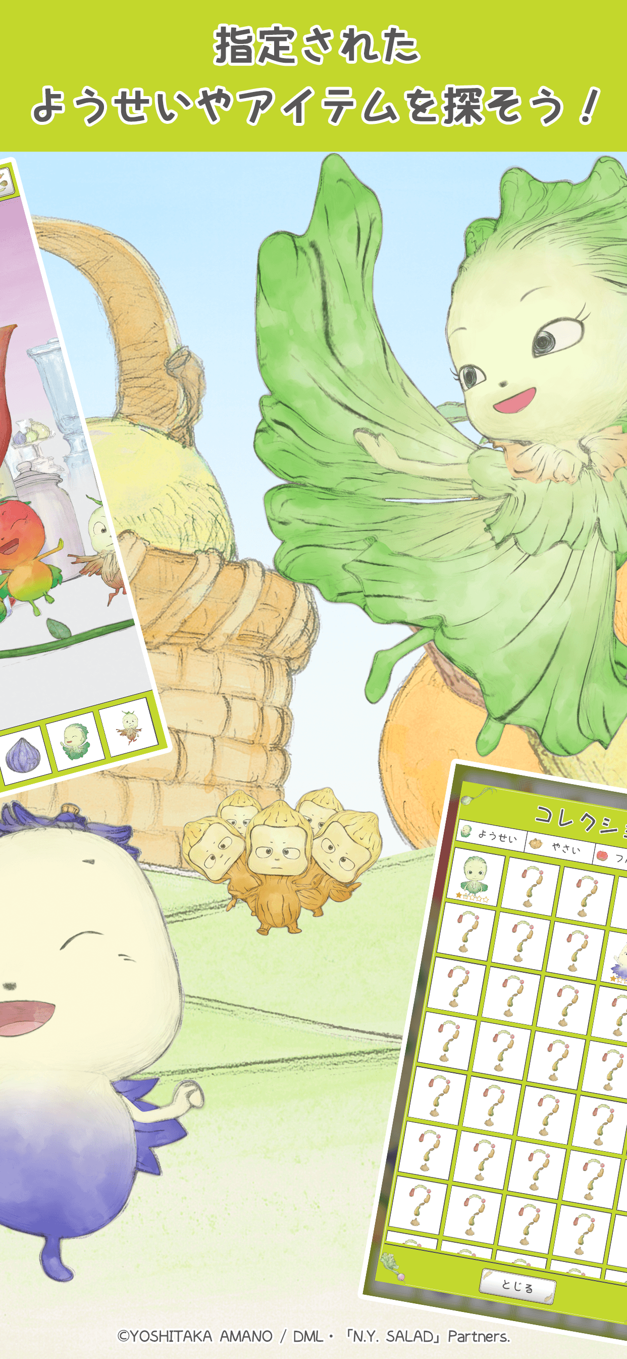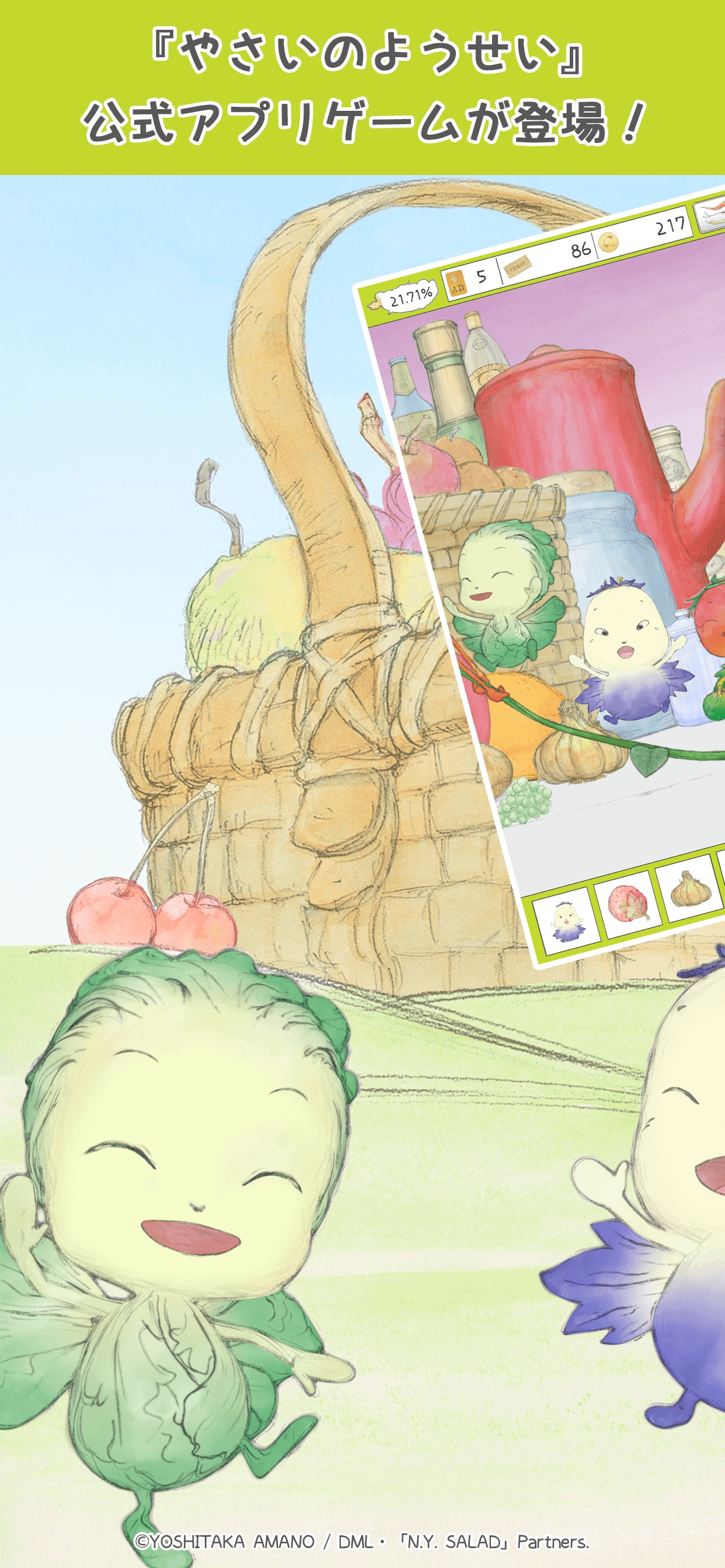 「ファイナルファンタジー」シリーズのビジュアル・コンセプトをデザインしたことで知られる世界的アーティスト・天野喜孝氏の画集「N.Y.SALAD」が原作のアニメ「やさいのようせい」初のゲームアプリ。