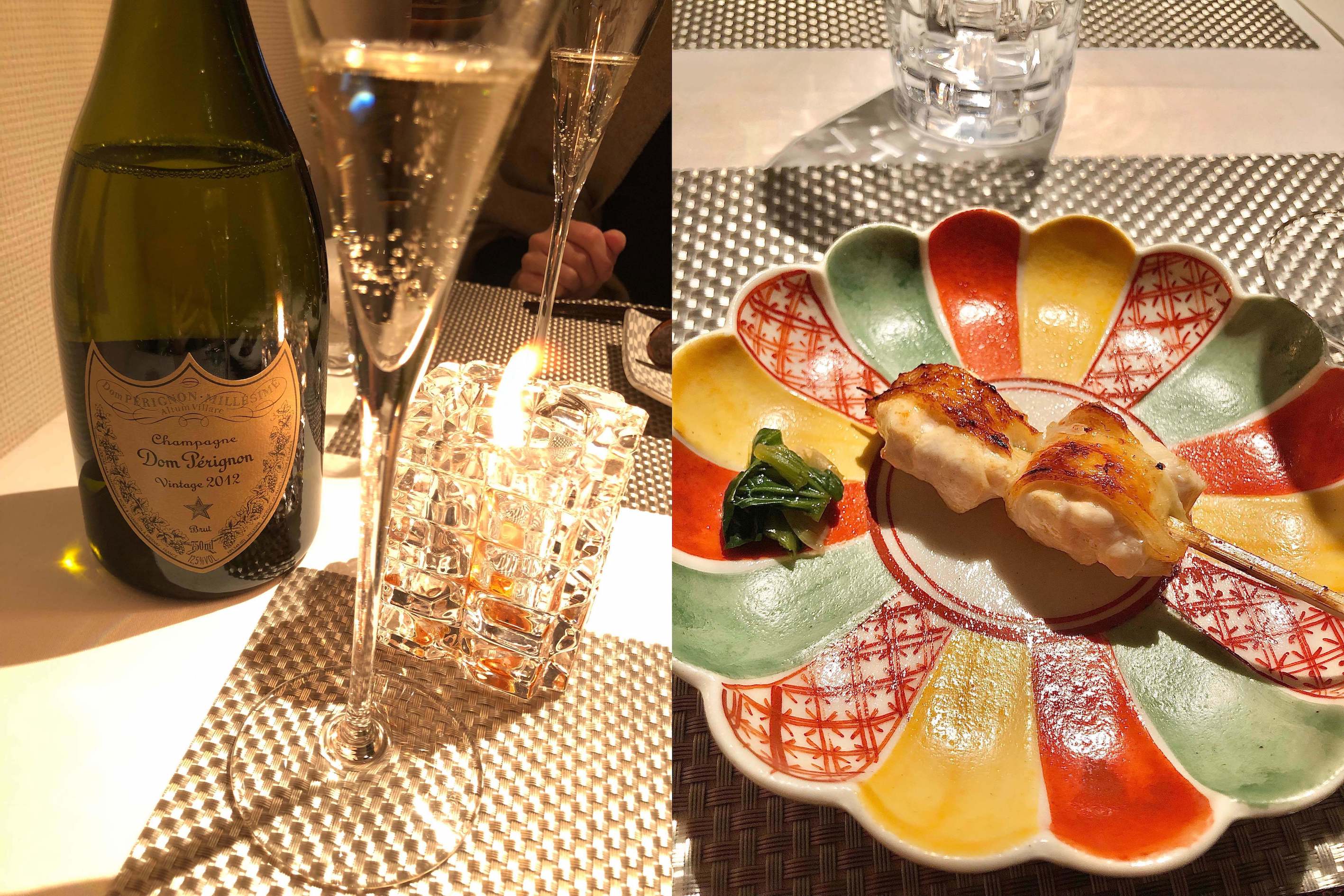 ▲左:ドンペリで乾杯(イメージ) 右:当店の人気串。だきみ(ムネ肉)
