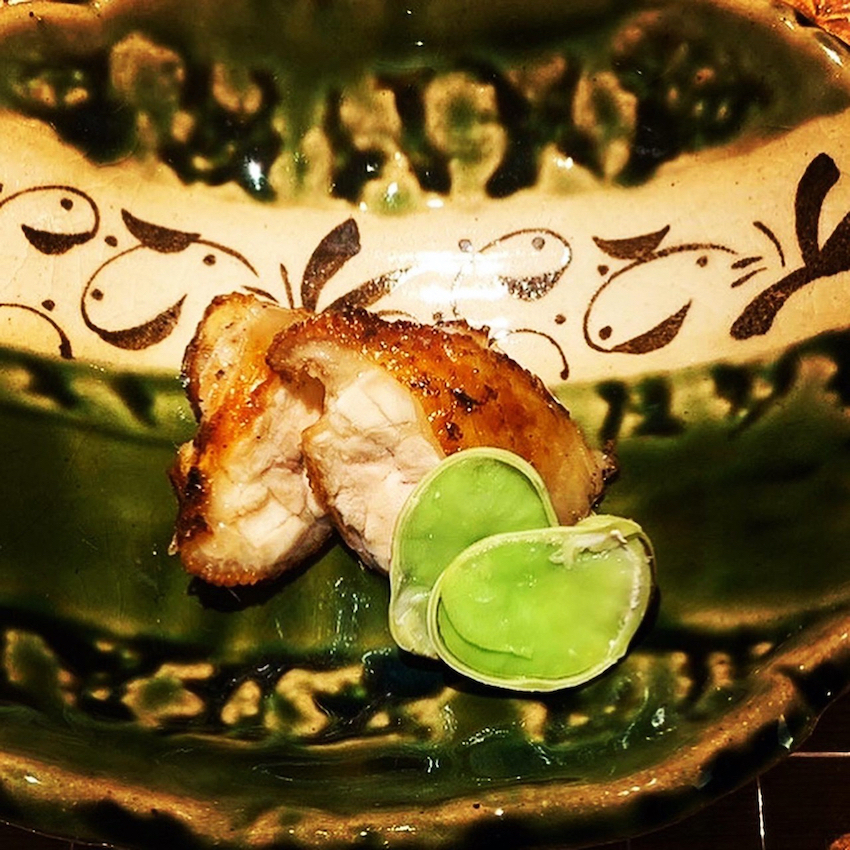 ▲オレンジ果汁入りの蜂蜜に漬け込んだ柔らかいもも肉。醤油味のワサビ葉がいいアクセント