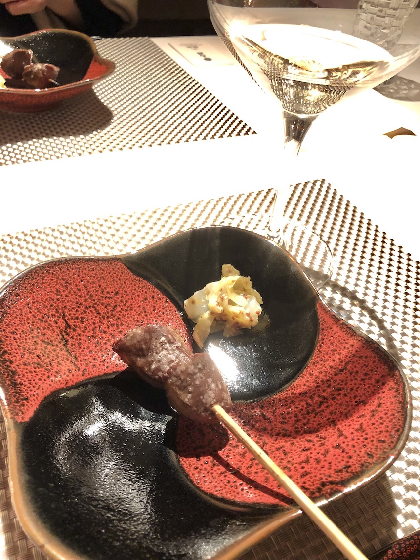 ▲日替わり串。北海道産の豚肉“夢の大地”を、すりおろした洋梨に漬け込んだもの。肉の自然な甘味と、酸味のあるリースリングワインなどとの相性が抜群